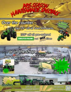 Minto AG is a family-owned and operated, full-service tractor and equipment dealership located near Harriston Ontario. In addition to our flagship brand, Deutz-Fahr tractors, we are known for our Krone hay equipment, Amazone tillage, seeding and spraying implements and Schaffer loaders. We also service and stock parts for Great Plains and Kverneland.