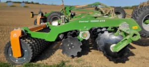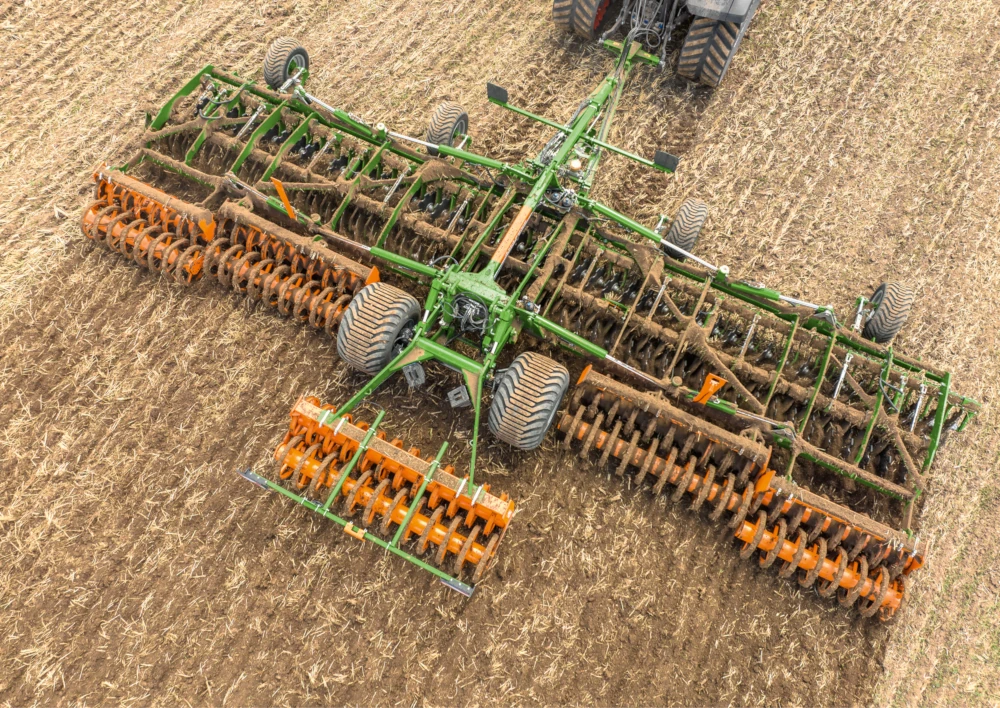 Smart Frame System | The Smart Frame System enables fully hydraulic working depth adjustment of the discs, conveniently direct from the cab, without any manual adjustment to the frame. Depth control is provided by the leading guide wheels and the following roller. The system thus offers maximum comfort for the driver and allows the working depth to be adjusted flexibly to suit the soil conditions. The system offers particular advantages in moist and heavy ground containing a lot of organic matter. By rotating the discs into the ground, when working deeper, the discs are swivelled away from the frame and rear packer. This increases the distance between the discs and the main frame and also between the discs and the following roller. This allows the free space in the Implement to be enlarged significantly, so that organic material can be easily mixed in, even under the most difficult of conditions. The height-adjustable end disc ensures optimum matching up to the previous pass. For farms that operate on a Controlled Traffic Farming basis, AMAZONE offers an optional extended disc element with a working width of 12.25 m for the Catros+ 12003-2TX. |