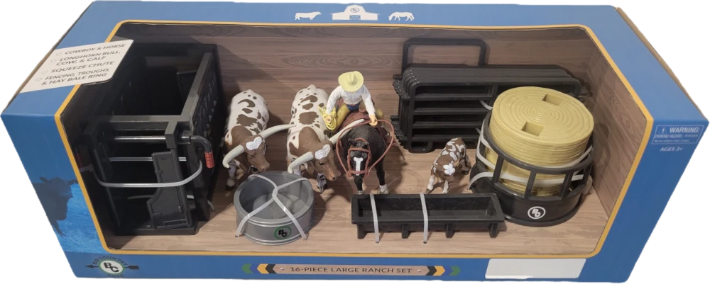 AUTHENTIC FUN: Kids can now replicate authentic ranch play right inside their home. In this set, you’ll find a Longhorn cow and calf pair, a Longhorn bull, a cowboy with quarter horse, 7-piece corral fencing, a cattle squeeze chute, water and feed troughs, a hay bale, and a hay ring. ENCOURAGES DEVELOPMENTAL LEARNING: Our playsets encourage imaginative play which helps develop fine motor skills, hand-eye coordination, and certain cognitive functions like quick-thinking processes. PERFECT GIFT: Big Country Toys playsets make the perfect gift for young cowboys and cowgirls. See the face of any child light up when they receive them this toy.