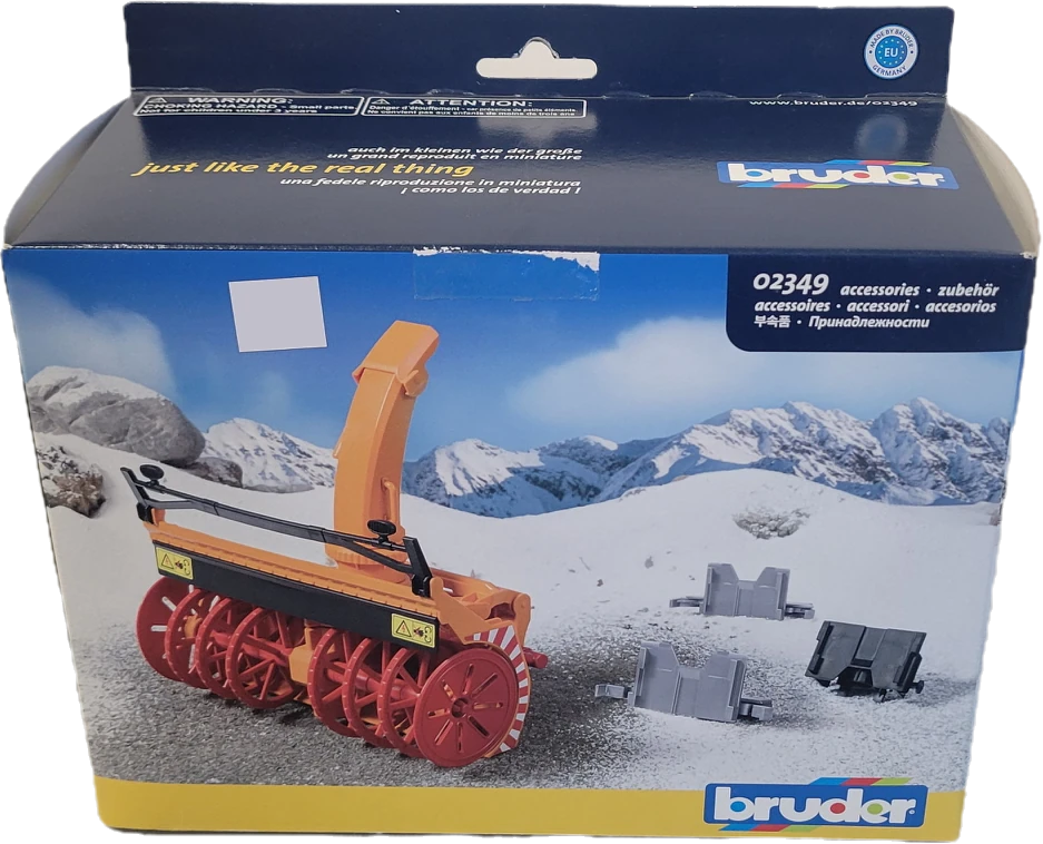 The Bruder snow blower is “just like the real thing” and is equipped with a powered, rotating milling roller and can be combined with the tractors of the 2000, 3000 and 4000 series, trucks and the MB Unimog from the professional series using the adapters provided. This allows children to realistically recreate snow removal. The rotating milling roller is powered by a friction wheel. The discharge of the snow blower can be rotated 360 degrees.