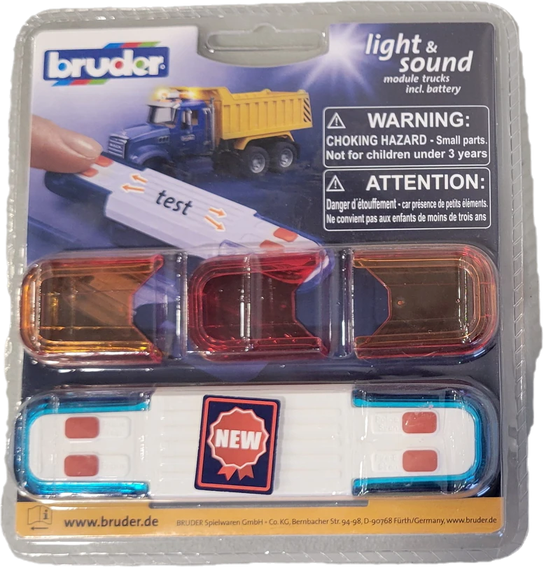 The new Light & Sound Module for trucks impresses with its modern design and enriches all Bruder trucks. Four different function buttons can be used to activate an engine sound, a police siren, and a fire siren for approximately 20 seconds, as well as a Yelp signal. This signal is particularly useful in heavy traffic situations and at intersections to draw attention to emergency vehicles’ blue lights. The light function is also active while the respective sound is playing. This can be combined with two blue lights (e.g., police), two orange lights (e.g., service vehicles), and one red light (e.g., US). The Light & Sound Module can be used in a variety of ways thanks to its Bruder standard connectors. An adapter is also included, which allows the Light & Sound Module to be used on all trucks with a roof hatch. The packaging is designed to allow the module to be tested before purchase.