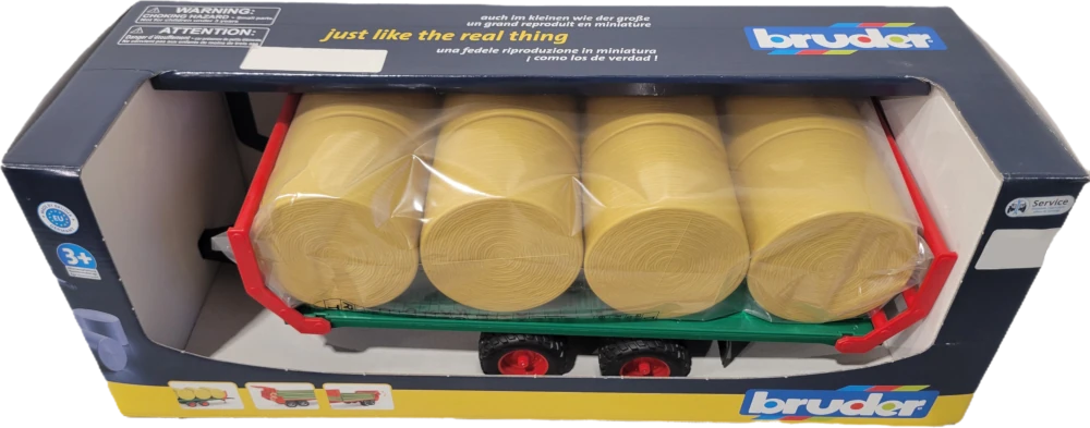 This model features foldable stanchions and comes with eight round bales. All of our tractors with front loaders and fork attachments can be used to load the trailer, creating a functional playset. Our round baler and square baler (item no. 02121 and 09800) and the round bale wrapper (item no. 02122) also combine perfectly with this play idea.