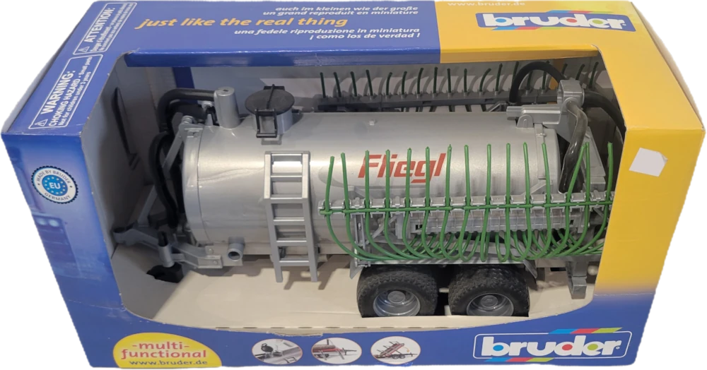 The Fliegl model barrel trailer with drag hose distributor can be filled with water and closed with a lid. The barrel trailer can be emptied again through the outlet valve. The drag hose distributor can be folded in when driving. The barrel trailer with drag hose distributor fits all tractors in the Profi series (not included).