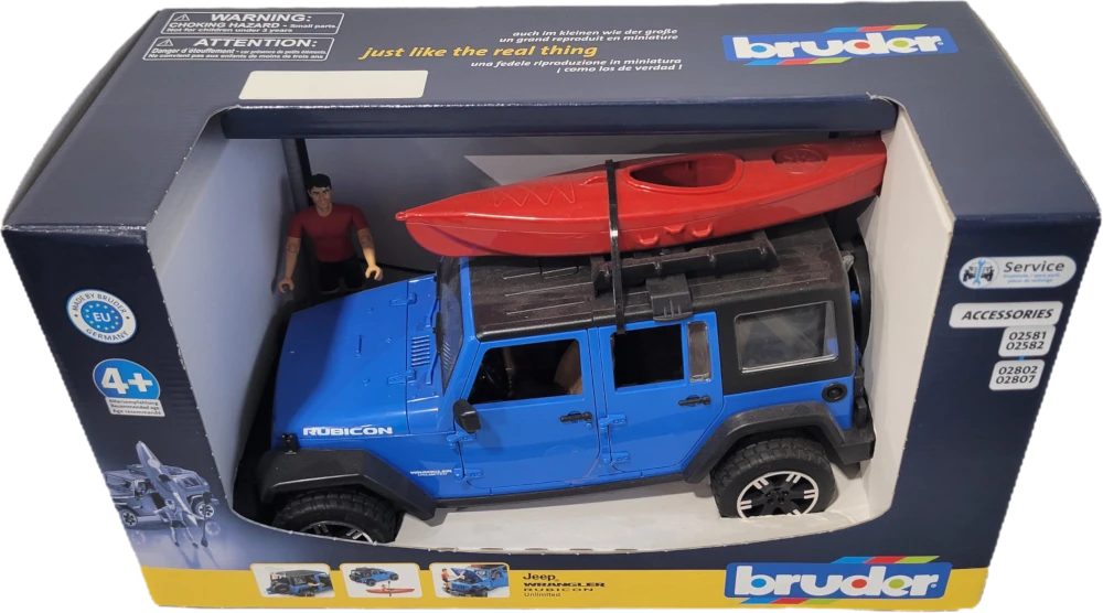 For accessing the most beautiful water sports areas, the Jeep Wrangler Rubicon Unlimited is a true off-road talent. In addition to the two-part removable segment roof, the hood, rear door, and all four doors can also be opened. Of course, the vehicle has enough space to accommodate four Bruder bworld figures. As an alternative to the full occupancy, the rear seat bench can be removed, allowing accessories to be added to the cargo area using the Bruder standard connectors. The additional steering column is used for easy steering through the roof hatch and can be stowed in the vehicle floor when not in use. The axles feature suspension as is typical for off-road vehicles, and the profiled wheels have chrome-plated rims with an attractive SUV look. The kayak is transported on the included roof rack.