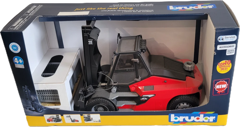 From Bruder, the Linde HT160 from this series is available as a detailed model in the commercial vehicle theme world. The model features easy-to-use steering, allowing children to maneuver in tight spaces, just like the real thing. A heavy-duty pallet and three wire mesh boxes are included for transporting large loads. From the wide Bruder transport range, the Man TGS Truck with Roll-off Container + Schaffer Loader 2630 (item no. 03767) and the smaller Linde model H30D (Art. No. 02511) are particularly well suited.