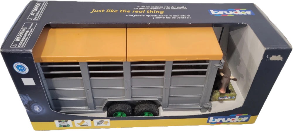 A versatile livestock trailer like this is new to the Bruder range. Our 1:16 scale model, like the original, lowers its platform to allow for easy loading of the animals and is equipped with a dividing gate. The tarpaulin and doors open easily, and the trailer can be combined with all tractors and vehicles with a standard trailer coupling. One cow is included in delivery; the trailer offers space for a total of six animals from accessories (item nos. 2308, 2309, and 2352).
