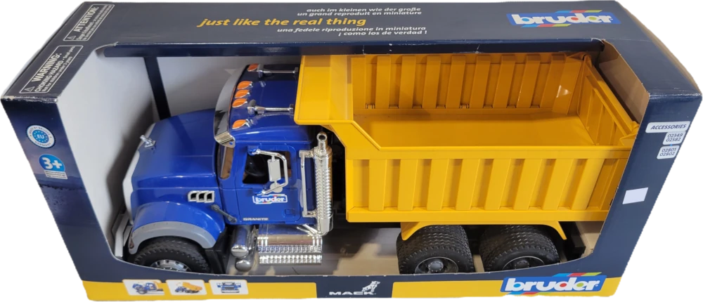 The “unbelievably” realistic driver’s cab with opening doors, a tilting hood that allows a view of the engine block, folding rearview mirrors, and numerous chrome-effect attachments is a real eye-catcher, and not just for trucking enthusiasts. The hydraulics allow the dump truck to be tilted, and the tailgate opens. To expand the play possibilities, the Mack Granite, equipped with a mounting bracket (on the bumper), can be equipped with a plow blade, mulching mower, or sweeper (not included). This truck, well-known from road construction, can be used by children both indoors and outdoors. This way, children can learn about the world of adults in a playful way.
