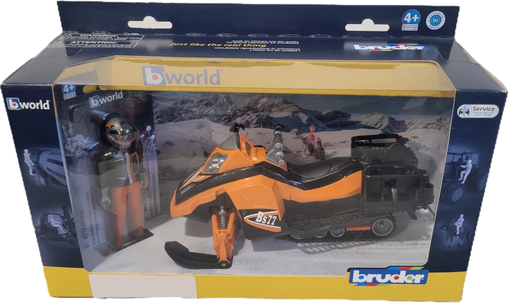 The Bruder snowmobile is suitable both for sporty driving and as a utility vehicle for all types of use on the slopes. The driver is naturally equipped with protective gear for fast rides on his snowmobile and wears a helmet and gloves. The fully suspended chassis with elastomer chain, combined with the pendulum front suspension of the skis, offers excellent handling on rough terrain. The snowmobile’s seat is suitable for two people, allowing for a bworld passenger to be taken along at any time. The ideal addition to this is, for example, the snowboarder (item no. 60420) from the extensive Bruder winter range.