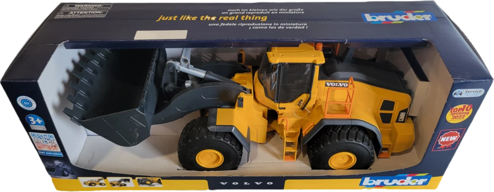 This impressive wheel loader is the latest highlight in Bruder’s construction vehicle range. The model of the Volvo L260H is equipped with a fully functional loading arm and an impressive, tilting bucket. The detailed cabin serves as a workstation for the well-known Bruder bworld figures. The rear engine hood can be opened for various service tasks.